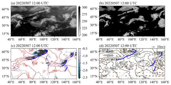 Cold fronts identified by the Cloud-DETR method at 12:00 UTC on 7 May 2022: (a) FY-2G infrared brightness temperature (shaded, K); (b) cloud image after preprocessing; (c) Cloud-DETR cold front (blue lines), cold advection at 850 hPa (shaded, 10−4 K/s) and temperature at 850 hPa (contours, K); (d) Cloud-DETR cold front (blue lines), sea-level pressure (contours, hPa) and surface (10 m) wind (arrows, m/s).