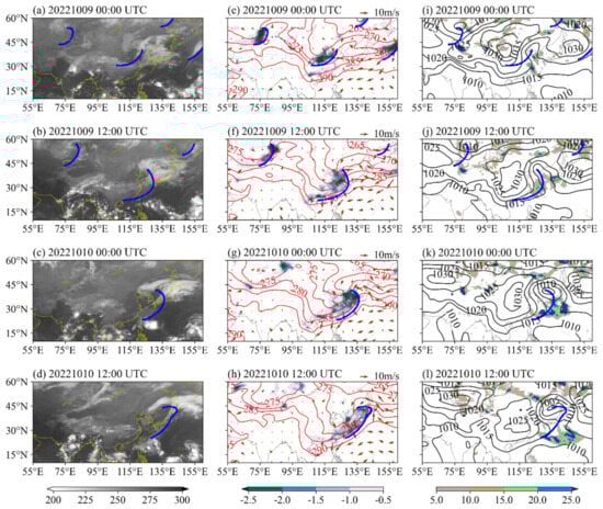 Cold fronts identified by the Cloud-DETR method (blue lines) from 00:00 UTC on 9 October 2022 to 12:00 UTC on 10 October 2022: (a–d) FY-2G infrared brightness temperature (shaded, K); (e–h) cold advection at 850 hPa (shaded, 10−4 K/s), temperature at 850 hPa (red contours, K) and surface 10 m wind (arrows, m/s); (i–l) 12-h accumulated precipitation (shaded, mm) and sea-level pressure (black contours, hPa).