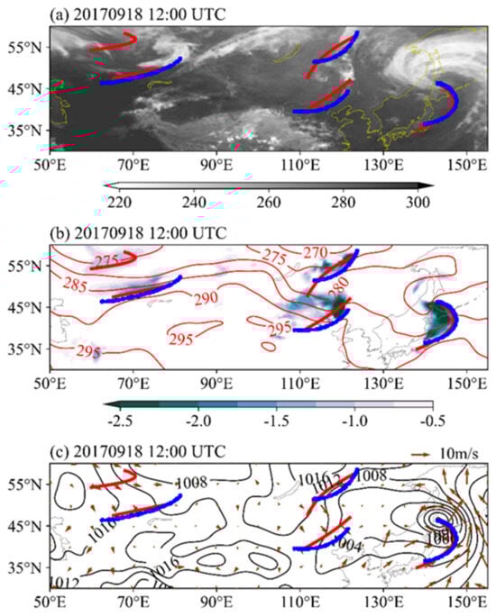 Cold fronts identified by the Cloud-DETR method (blue lines) and two-step method (red lines) at 12:00 UTC on 18 September 2017: (a) FY-2G infrared brightness temperature (shaded, K); (b) cold advection at 850 hPa (shaded, 10−4 K/s) and temperature at 850 hPa (red contours, K); (c) sea-level pressure (black contours, hPa) and surface (10 m) wind (arrows, m/s).