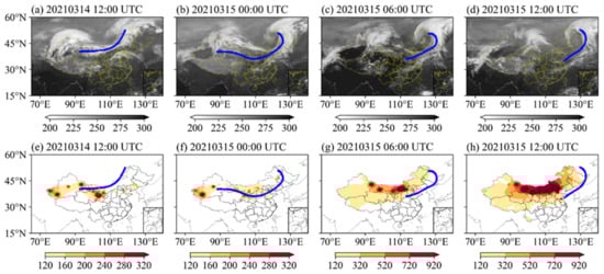 Cold fronts identified by the Cloud-DETR method (blue lines) from 12:00 UTC on 14 March 2021, to 12:00 UTC on 15 March 2021: (a–d) FY-2G infrared brightness temperature (shaded, K); (e–h) PM10 (shaded, μg·m−3).