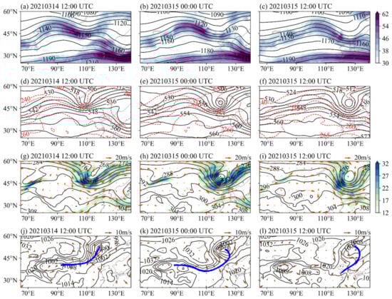 From 12:00 UTC on 14 March 2021 to 12:00 UTC on 15 March 2021: (a–c) geopotential height (contours, dagpm) and wind with speed higher than 30 m/s (shaded, m/s) at 200 hPa; (d–f) geopotential height (black solid contours, dagpm) and temperature (red dotted contours, K) at 500 hPa; (g–i) geopotential height (contours, dagpm) and wind (arrows, m/s, the wind speed in the shaded area is higher than 12 m/s) at 700 hPa; (j–l) Cloud-DETR cold front (blue lines), sea-level pressure (black contours, hPa) and surface 10 m wind (arrows, m/s).