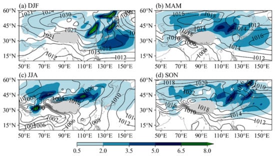 The proportion of cold fronts occurrence (shaded, %) and sea-level pressure (contours, hPa) in (a) winter, (b) spring, (c) summer, and (d) autumn from 2005 to 2023.