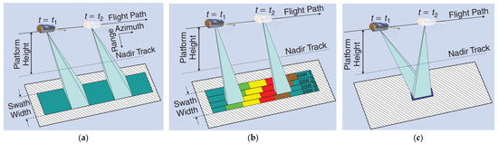 Geometry diagrams of different spaceborne SAR imaging modes which have different swath widths and azimuth resolutions (Reprinted with permission from [35]. Copyright © 2013, IEEE). (a) Stripmap; (b) scanSAR; (c) spotlight.