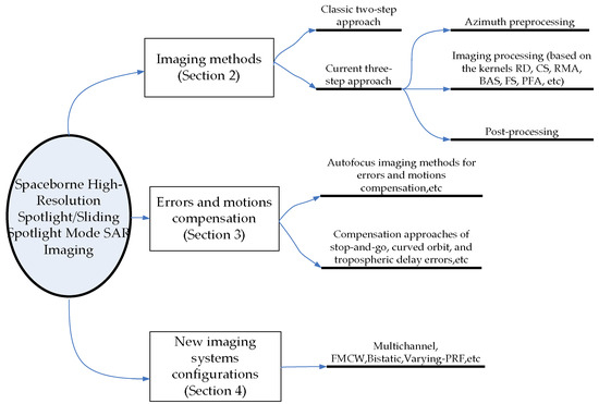 The synthetic aperture radar (SAR) technique is already widely used in microwave remote sensing applications [1,2,3,4,5,6,7,8,9,10]. In a performance evaluation of the SAR system, wider swath is an important demand [11,12,13,14]. Current typical SAR algorithms include the time domain algorithm [15,16,17,18,19,20,21,22,23], frequency domain algorithm [24,25,26,27,28,29,30,31,32,33,34], and time frequency hybrid algorithm [35,36,37,38,39]. The classical time domain algorithms are based on the BP algorithm [15,16,17,18,19,20,21,22,23]. At present, the typical frequency domain algorithm is the range Doppler (RD) algorithm [24,25,26,27], chirp scaling (CS) algorithm [28,29,30,31], and range migration algorithm (RMA) [32,33,34]. As shown in Figure 1 and Figure 2, by steering the antenna radiation pattern, current spaceborne SAR imaging systems are operated in different modes (stripmap, scanSAR, spotlight, sliding spotlight, and terrain observation by progressive scans (TOPS)) [35,36]. The system is operated in scanSAR mode if a wider swath is required. As shown in Figure 1b, by controlling the elevation angles of the antenna, different sub-swaths are illuminated in scanSAR mode. Thus, the illumination time of each sub-swath in scanSAR mode is shorter than the swath of stripmap mode. Due to the antenna elevation patterns steering along multiple sub-swaths continuously, the azimuth imaging resolution of scanSAR mode is lower than stripmap mode. If a higher azimuth resolution is required, as shown in Figure 1c, spotlight mode can be used. A fixed imaging region is always illuminated by steering the antenna angle. Consequently, a longer illumination time and synthetic aperture length are obtained for this fixed imaging region. This results in a higher resolution for spotlight mode. As shown in Figure 2a, the sliding spotlight imaging mode adopts a lower antenna steering amplitude than spotlight mode. The antenna beam in the imaging scene will have a sliding movement. The rotation center of the sliding spotlight imaging mode will be outside the scene, which is different from the spotlight imaging mode. Therefore, sliding spotlight imaging mode has lower resolution but wider azimuth scene size than spotlight mode. Based on this, in spotlight or sliding spotlight imaging, the steering angle and the rotation center position of the antenna beam need to be designed according to the requirement of imaging resolution and scene size. However, the imaging algorithm of spotlight and sliding spotlight imaging can be the same. As shown in Figure 2b, TOPS mode operates oppositely compared to sliding spotlight imaging mode. Compared to stripmap mode, TOPS imaging mode increases the azimuth coverage size but degrades the azimuth resolution. In object detection and recognition applications, higher resolution is useful for describing more precise geometry structures and finer features of objects. This results in higher detection or recognition accuracy. As elaborated above, spotlight/sliding spotlight modes can obtain higher resolution than the other imaging modes. Thus, spotlight/sliding spotlight imaging modes are widely used in object detection and recognition applications. Table 1 and Table 2 present the number of journal and conference publications related to the topics of spaceborne spotlight/sliding spotlight mode SAR imaging from 2014 to 2024 (collected on 15 October 2024 from Engineering Village). From Table 1 and Table 2, we can see the research area of spaceborne spotlight/sliding spotlight mode SAR imaging is still developing in recent years and there are still some problems which need to be investigated. Table 3 presents some parameters of the main commercial SAR satellites, which have spotlight/sliding spotlight mode. From Table 3, we can see the frequency bands of the current commercial SAR satellites mainly focus on L, C, and X bands. The spotlight resolution of them can be up to 1 m and higher. These current commercial SAR satellite data are already used for disaster monitoring, environment resources exploring, ocean observation, agricultural biomass estimation, digital elevation model (DEM) mapping, military reconnaissance, etc. This paper will review the progress of spaceborne spotlight/sliding spotlight SAR imaging field. Figure 3 is the structure of this paper.