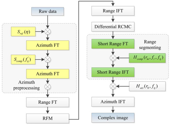 In [51], a frequency scaling algorithm (FSA) for spaceborne spotlight/sliding spotlight SAR full-aperture imaging was proposed. The processing steps include azimuth convolution for preprocessing, a modified FSA, and post-processing by azimuth convolution. Similarly to the three-step spotlight/sliding spotlight SAR imaging method based on CS or RMA kernel, an azimuth convolution preprocessing is operated in the first step. Next, an improved azimuth filter and a scaling factor were applied to realize RCMC and azimuth domain compression accurately. The final SAR focused image may be back-folded due to the compressed azimuth time domain. Therefore, in the final step, an azimuth convolution post-processing is introduced to eliminate aliasing in the azimuth time domain of SAR image after the FSA.