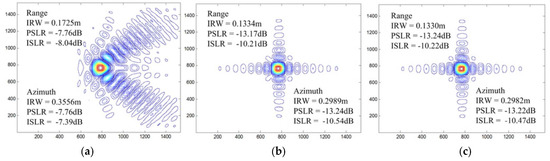 In a classical SAR system, the pulse system is generally adopted. With the carrier signal frequency band increasing, the system also requires higher peak transmitting power. The SAR system using frequency modulated continuous wave (FMCW) transmitting and receiving mechanism needs lower peak transmitting power. It will reduce the hardware cost for the transmitter [77,78]. However, in an FMCW-based SAR system, the “stop-and-go” approximation model is not available because of the continuous changes in the transmitted and received signals as the platform moves. An FMCW SAR imaging algorithm for sliding spotlight mode was proposed in [79]. First, azimuth deramp preprocessing is carried out for eliminating the aliasing of the azimuth frequency spectrum; then, ωk kernel is used for the imaging processing of FMCW SAR echoed signal; finally, in post-processing for focusing the SAR image, azimuth deramp operation is utilized to avoid the aliasing in the image domain [79]. Figure 22 presents the FMCW-based sliding spotlight mode imaging results as shown in broadside case and squinted case, respectively. In the simulation shown in Figure 22, the center frequency and bandwidth are 35 Ghz and 6 Ghz, respectively. We can see the imaging results focus well from Figure 22.