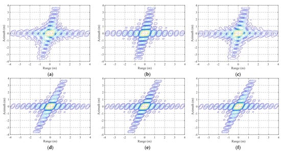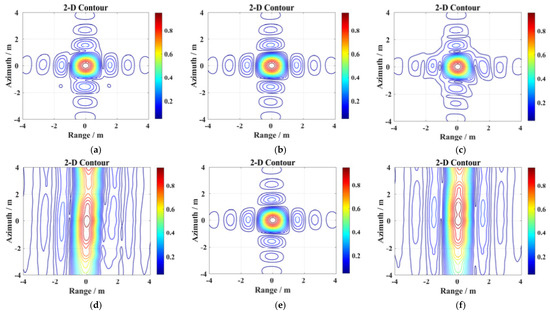 Two-dimensional contours comparison of imaging simulation results in high-squinted spaceborne spotlight/sliding spotlight SAR case (Reprinted with permission from [48]. Copyright © 2024, IEEE). (a–c) Modified CS kernel-based algorithm proposed in [45]. (d–f) Modified RMA kernel-based algorithm proposed in [48].