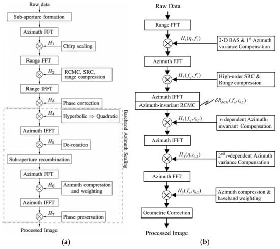 Block diagram of a BAS imaging method for sliding spotlight mode (a) broadside case (Reprinted with permission from [49]. Copyright © 2010, IEEE); (b) squinted case (Reprinted with permission from [50]. Copyright © 2020, IEEE).