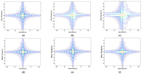 Two-dimensional contours of simulation results of different imaging algorithm in squinted spaceborne spotlight/sliding spotlight SAR case (Reprinted with permission from [50]. Copyright © 2020, IEEE). (a–c) Modified CS kernel-based algorithm proposed in [45]. (d–f) Two-dimensional BAS-based algorithm proposed in [50].