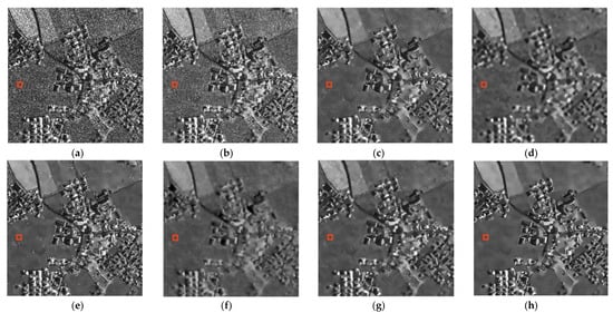 Despeckle results of TerraSAR-X spotlight mode data using different methods (Reprinted with permission from [4]. Copyright © 2024, IEEE). (a) Noisy. (b) SAR-BM3D. (c) PPB. (d) NOLAND. (e) GGF-BNLM. (f) Speckle2Void. (g) NIFT. (h) NIFT-iteration.