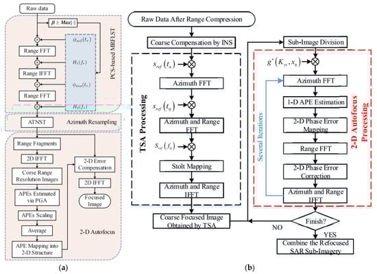 By integrating two-step scaling transform (TSST) with structure-aided 2-D autofocus, a spotlight SAR imaging algorithm was developed for the squinted angle case [56]. As shown in Figure 14a, an azimuth–time nonlinear scaling transform (ATNST) and a modified range–frequency linear scaling transform (MRFLST) were first developed to degrade the echoed signal coupling between the azimuth–time domain and the range–frequency domain. Furthermore, during MRFLST implementation, fast Fourier transforms (FFTs) and complex multiplications, which do not have interpolation, were involved to improve efficiency. Meanwhile, in order to avoid range frequency spectrum aliasing, a constant scaling factor was selected as a criterion. Then, in the TSST, the prior structure information of 2-D phase error, which is caused by the atmospheric propagation effect and the motion measurement error, is studied for phase error corrections. Finally, a 2-D autofocus SAR imaging approach was proposed by combining the range frequency fragmentation technique and the obtained structure of 2-D phase error.