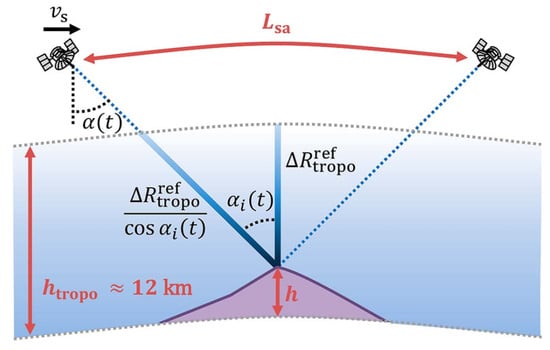 In spaceborne SAR, an undesired phase delay on the order of 2–4 m caused by the troposphere is added to the transmitted and echoed electromagnetic signal. This should be compensated in spaceborne SAR but does not need to be considered in airborne SAR. The zenith path delay through the troposphere can be modeled by a quadratic [68] or an exponential [69,70] function, which is related to the target height. The troposphere phase delay can be given by the following equation: