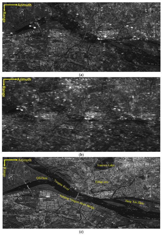 (a) Single-channel sliding spotlight SAR imaging result (Reprinted with permission from [74]. Copyright © 2022, IEEE). (b) Dual-channel sliding spotlight SAR imaging result, which does not consider phase mismatch. (c) Dual-channel sliding spotlight SAR imaging result, which considers phase mismatch [74].