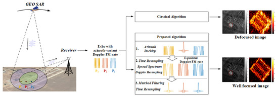 The stripmap mode bistatic SAR (BiSAR) configurations mainly include two types: translational-variant BiSAR and translational-invariant BiSAR [80,81]. RD, CS, and RMA kernel-based monostatic algorithms can also be modified for the translational-invariant BiSAR imaging case. Due to the difference between monostatic and bistatic configurations, additional range variance needs to be considered in the modified algorithms [82,83,84,85]. Translational-variant BiSAR, consisting of one stationary platform [86], bistatic forward-looking [87], and other nonequal-speed and nonparallel configurations, needs the other compensations for varied phase errors along the azimuth direction [88,89,90,91,92]. The aforementioned BiSAR imaging models are generally limited to the uniform straight trajectory. Furthermore, the bistatic spotlight synthetic aperture radar (BSSAR) [93,94,95,96,97] imaging technique has a potential application ability in reconnaissance. In [93], the resolution characteristic of the sliding spotlight geostationary earth orbit spaceborne–airborne bistatic (GEO SA-Bi) SAR system was analyzed. Firstly, the common azimuth coverage and coherent accumulated time are investigated theoretically. Then, the GEO SA-Bi SAR resolution is computed accurately by using the gradient method. As shown in Figure 23, the imaging model of sliding spotlight mode GEO low-earth-orbit bistatic SAR (GEO-LEO BiSAR) was studied in [96]. At the assumption of equivalent circular orbit trajectory, a bistatic range model was proposed to describe the range history of sliding spotlight mode GEO-LEO BiSAR [96]. Then, based on this model, an imaging method was presented to decrease the 2-D spatial variance and obtain the imaging results accurately. First, due to the influence of beam steering and azimuth variation in the Doppler centroid, a two-step preprocessing method was implemented to alleviate Doppler aliasing. Then, considering satellite motion parameters vary along the azimuth direction due to the influence of the curved trajectory, azimuth trajectory scaling was derived to solve this problem. As shown in Figure 24, by using TerraSAR-X as a transmitter, the spaceborne/stationary bistatic SAR (SS-BiSAR) imaging results were implemented in [94]. From Figure 24, we can see different angles have obvious scattering differences for the same ground object. The bistatic GEO SAR system, which means a geosynchronous SAR is used as the transmitter and a ground stationary instrument is used as the receiver, is shown in [95]. The imaging geometry structure of bistatic GEO SAR and the corresponding flowing diagram are presented in Figure 25. In addition to the conventional imaging kernels, a subaperture (SA) parametric polar format algorithm (PFA) could also be utilized for BSSAR imaging [97].