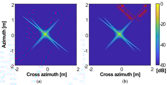 The interpolated impulse response function (IRF) of a corner reflector (CR) processed by the RD algorithm (Reprinted with permission from [61]. Copyright © 2014, IEEE). (a) Using the processing chain shown in Figure 16 with the corrections. (b) Using the processing chain shown in Figure 16 without corrections.