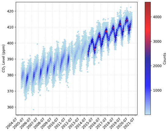 Over the past two decades, numerous satellites have been launched to monitor atmospheric carbon dioxide, including SCIAMACHY, GOSAT, OCO-2 [8,9,10], and China’s TANSAT, GF-5, and DQ-1 [11,12]. These satellites use spectroscopic analysis technology to obtain XCO2 data, which is widely used in scientific research and policymaking [3,13]. However, factors such as cloud cover, sensor limitations, and orbital constraints can lead to data gaps in satellite observations [12]. These gaps hinder the comprehensive analysis of XCO2’s spatial and temporal variations, particularly at regional scales.