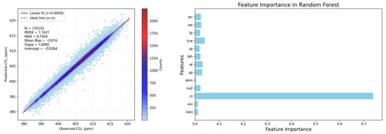 Through comparison with the test dataset (accounting for 20% of the total data), we found that the model’s prediction results exhibit excellent agreement with the satellite observation data, with an R-value greater than 0.99; the root mean square error (RMSE) is 1.1631 ppmv; the mean absolute error (MAE) is 0.7424 ppmv; the mean bias is −0.016 ppmv; the slope of the fitted line is 1.0000, and the intercept is 0.0264. The overall fitting results indicate a strong correlation between the predicted XCO2 and the observed XCO2 within the Chinese region.