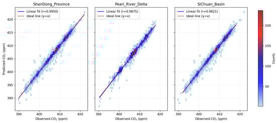 As shown in Figure 5, the R-values of the model in China’s Shandong Province, Sichuan Basin, and Pearl River Delta regions are 0.9950, 0.9875, and 0.9821, respectively; the root mean square errors (RMSE) are 0.5748 ppmv, 0.8408 ppmv, and 0.9611 ppmv, respectively. These results indicate that the model exhibits good fitting performance in the typical regions and can accurately predict the regional column concentrations of carbon dioxide. Among the three typical regions selected in this paper, Shandong Province yields the best model fitting results with a slope and intercept of 0.9980 and 0.8086, respectively, and the fitting line is close to the 1:1 line. The R-values of the model in the Pearl River Delta and Sichuan Basin are slightly lower than those in Shandong, with intercepts of −4.8848 and 1.5278 for the fitting lines, respectively. The poorer results in these regions can be attributed to the increased instability of the model due to the limited number of effective satellite observations. Overall, however, the predictive capability of the model is consistent at both regional and overall scales, indicating good generalization ability of the model.