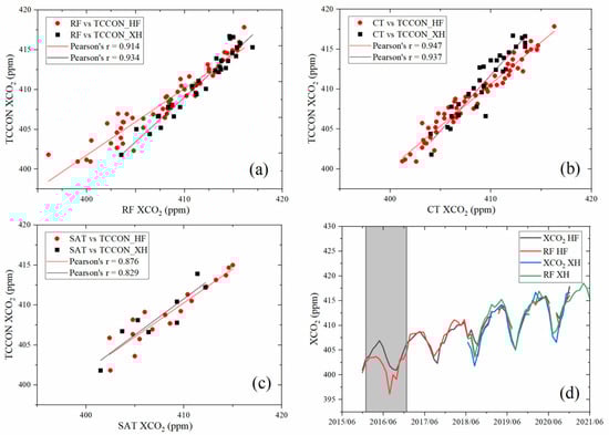 (a) Data pairs compared with TCCON for RF; (b) data pairs compared with TCCON for CT; (c) data pairs compared with TCCON for SAT; (d) monthly TCCON XCO2 compared with RF, The shaded areas show the comparison results for 2016.