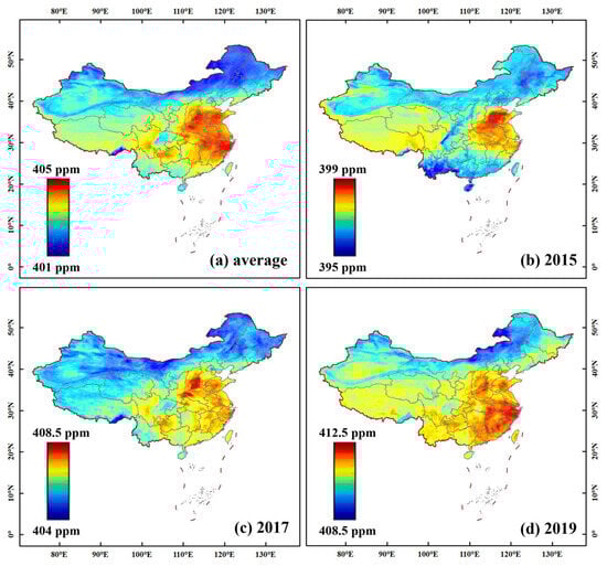 Spatial distribution pattern of XCO2: (a) average from 2015 to 2020; (b) result for 2015; (c) result for 2017; (d) result for 2019.