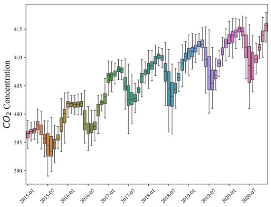 Data from 2015 to 2020 were selected from the generated continuous monthly CO2 column concentration (XCO2) dataset, and 10,000 data points were randomly selected from the monthly raster images to describe the XCO2 concentration in this month, as shown in Figure 8. The figure reveals pronounced seasonal fluctuations in CO2 concentrations, with higher levels in winter and relatively lower levels in summer. This pattern may be attributed to increased heating demands during winter and enhanced CO2 absorption capacity due to lush vegetation in summer. These findings indicate that the model has effectively captured the spatiotemporal variations in CO2. The difference between the monthly changes in 2015–2016 and 2017–2020 may be due to differences in the payloads and inversion algorithms of the GOSAT and OCO-2 satellites, resulting in inferior mapping results for overlapping years than for years using single-satellite data.