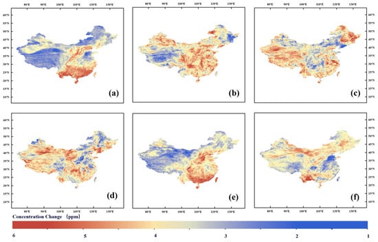 Interannual variation distribution of XCO2: (a) average from 2015 to 2020; (b) variation from 2019 to 2020; (c) variation from 2018 to 2019; (d) variation from 2017 to 2018; (e) variation from 2016 to 2017; (f) variation from 2015 to 2016.