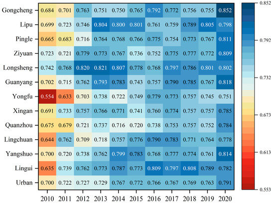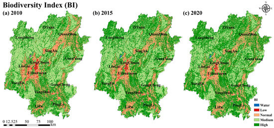 - Strengthen biodiversity governance capacity: Remote sensing technology was employed to monitor and evaluate biodiversity levels in Guilin’s districts and counties. The results indicate that urban areas exhibited the lowest biodiversity due to being primarily built-up areas dominated by construction land, heavily impacted by human activities. Therefore, it’s necessary to enhance biodiversity protection measures, such as designating core conservation areas in ecologically sensitive areas in mountainous regions, implementing biodiversity monitoring programs to track the number of species and ecosystem health in the long term, and regulating tourism and human activities in important habitats to reduce disturbances, so as to improve the ecological environment’s quality, establish a more suitable terrestrial ecosystem for biological survival, and promote harmonious coexistence between humans and nature.