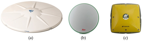 GNSS receiver antennas utilized in experimental validation of the developed LMMT calibration system; (a) Trimble Zephyr 2 Geodetic (TRM57971.00 NONE and TRM55971.00 NONE); (b) Leica Geosystems AX1202 GG (LEIAX1202GG NONE); (c) Topcon PG_A1 (TPSPG_A1 NONE).