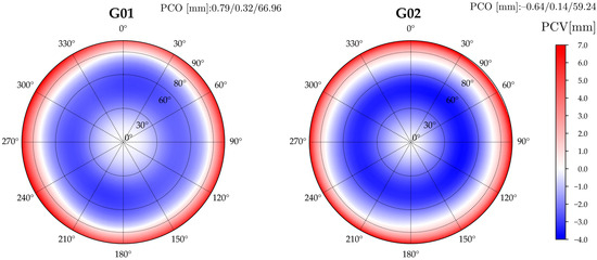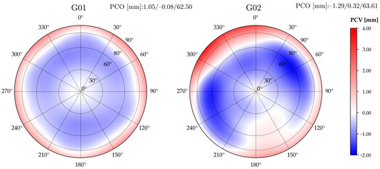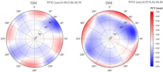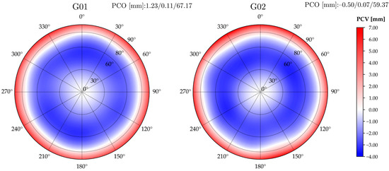 To experimentally validate the LMMT GNSS receiver antenna calibration facility and its calibration results, a comparative analysis was conducted with independent calibrations obtained by Geo++ GmbH. Dual-frequency calibration results for the TRM57971.00 NONE antenna (S/N: 30739001, I/L: Z1) were compared at the pattern level. PCC difference patterns , per frequency (G01 and G02), were calculated and are illustrated in Figure 12. PCC difference values were calculated for the entire upper antenna hemisphere, i.e., and , using an angular grid defined by azimuthal and zenithal increments of 5°. To quantitatively assess the accuracy of the LMMT calibrations, scalar metrics were derived from the calculated PCC difference patterns. These metrics are presented, per frequency, in Table 4.