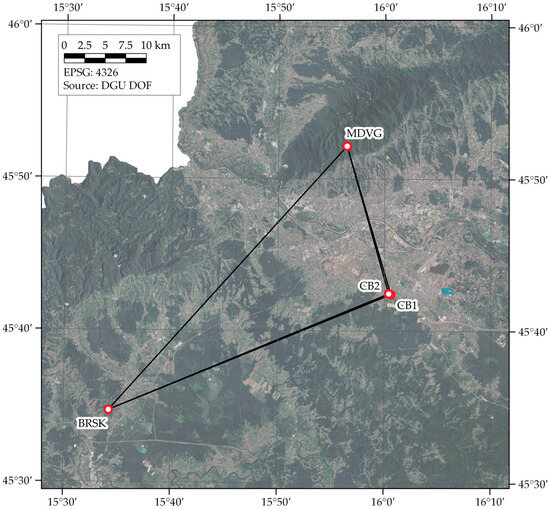 The third experimental validation was conducted at a GNSS/GPS network solution level, i.e., based on the adjustment results of a GNSS/GPS network. Four GNSS receiver antennas (I/L: Z1, Z2, Z3, Z4) were utilized for the validation test, forming a network of four stations: CB1 (antenna Z1), CB2 (antenna Z2), BRSK (antenna Z3), and MDVG (antenna Z4). The GNSS/GPS network is depicted in Figure 8.