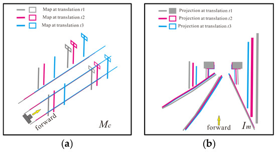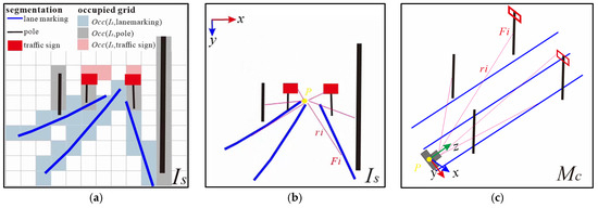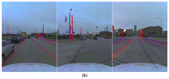 - If the longitudinal difference of lane markings : Increase the weights for poles and traffic signs and prevent the optimization of translation. () indicates the vehicle’s location entering a road intersection. This accounts for unreliable lane markings in intersections, prioritizing independent objects and preserving spatial relationships.