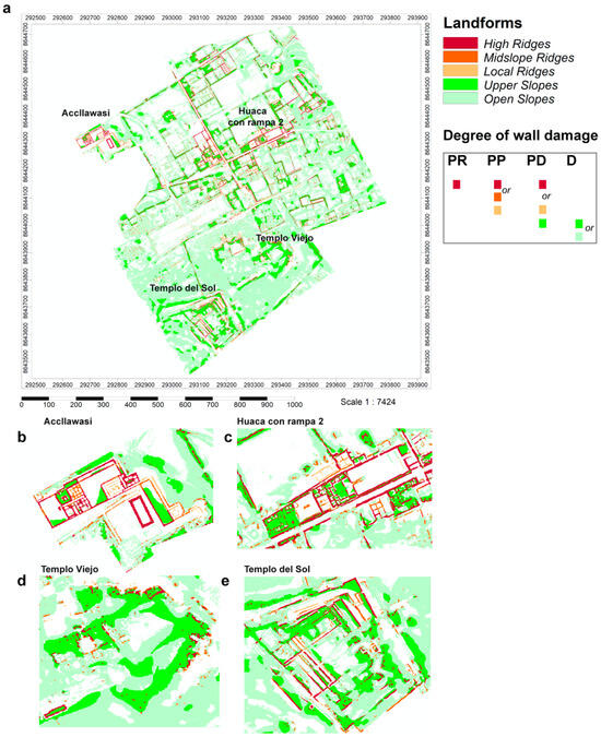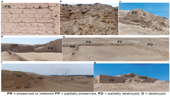 - Individual SPAC buildings are frequently bounded by walls with a different degree of preservation, with the PD and D walls reflecting the punctual action of earthquakes and El Niño–Southern Oscillation events. PR and PD walls usually characterize the restructured and renewed constructions. The general state of conservation of SPAC is low, with large sectors of the archaeological site characterized by PD and D buildings. The older temples are also poorly conserved. The increasing intensity and duration of rain events due to climate change is a major driver of damage to adobe constructions. This has been observed in many archaeological sites worldwide, including North America, South America, Europe, and Asia [50,51]. As observed at SPAC, these events increase the erosion of adobe, so triggering, in some cases, the partial or total collapse of walls. Therefore, the analysis of the relationships between climatic events, such as rain, and the damage to archaeological structures is of primary importance in recognizing successful conservation methods. In this framework, the acquisition of multitemporal data from remote-sensing techniques could provide relevant information on the amount of progressive erosion of adobe walls due to climatic factors with time. The methodological approach we propose at SPAC could be used as the basis for such a multi-temporal analysis and can be applied outside the archaeological field to assess the state of damage of more recent buildings affected by damage caused by natural events, such as earthquakes, or war events, such as bombings. We underline how the morphometric parameters generally used in geomorphology for the study of landforms may be successfully used to semi-quantitatively estimate the degree of preservation of buildings.