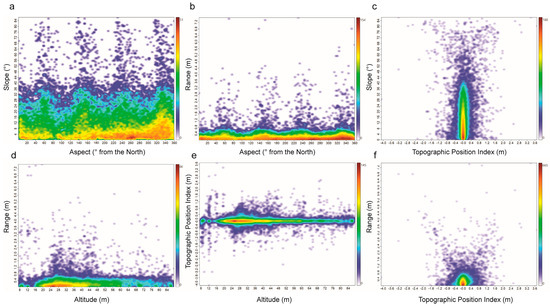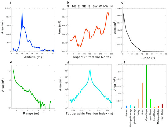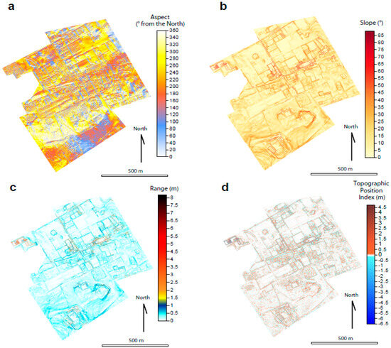 - Range is a measure of value equal to the maximum minus the minimum of the altitude values of neighboring pixels. Range is the measure of the relief at a local scale (Figure 4c). This parameter has been calculated following Sofia (2020) [42] on a matrix of 3 × 3 pixels. In the DSM of SPAC, this matrix covers an area of 0.81 m2. The measurement unit is m;