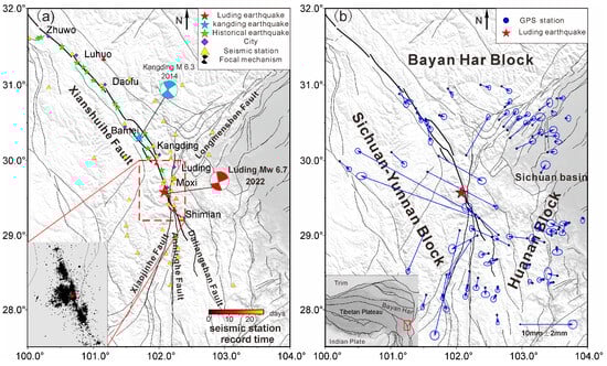 Tectonic map of the Luding earthquake region. (a) The red star marks the mainshock epicenter in Luding, and the blue star marks the Kangding earthquake, while the green star indicates historical earthquakes with magnitudes ≥ 6.5 in the past 300 years. The colored triangles denote the durations recorded by broadband seismic stations during the study period. The violet squares represent cities, and the black dots indicate the distribution of detected seismic activity. (b) The blue arrow represents the horizontal displacement derived from the Global Positioning System (GPS). Blue dots indicate GPS stations. The inset map indicates the regional tectonics.