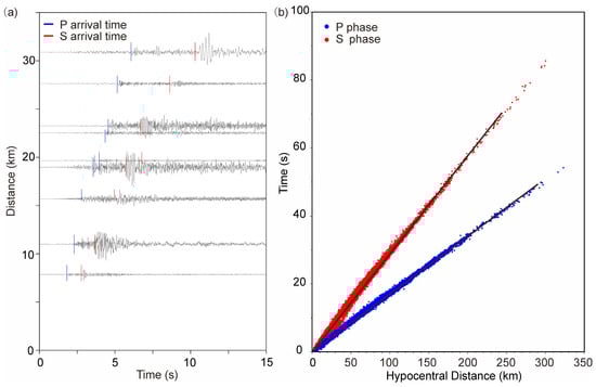 Phase picking and association. (a) An example of earthquake association using USTC-Pickers to determine the arrival times of the P-wave (blue line) and S-wave (red line). Only the vertical component of the waveform is displayed, and it is band-pass filtered in the frequency range of 1–10 Hz; (b) travel time–hypocentral distance curves for the associated events. The black line represents the fitted approximate velocities of the P-wave (6.0 km/s) and S-wave (3.5 km/s).
