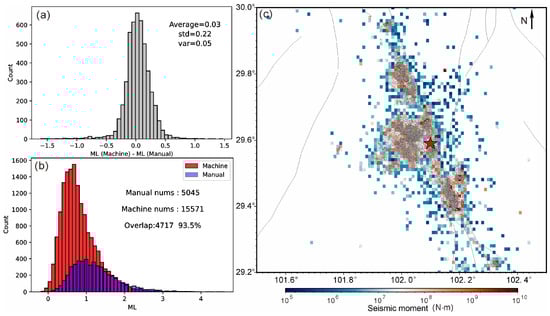 Compared to the manual catalog, which contains 5045 events, we detected a total of 15,571 events, approximately three times as many. Of these, 4717 events, or nearly 93.5%, overlapped with the manual catalog, demonstrating the reliability of our detection process. The local magnitude (ML) of each earthquake event was calculated based on the relationship between the horizontal component of the S-wave amplitude and the magnitude []. The average magnitude difference between our catalog and the manual catalog was 0.2, with the corrected difference remaining within 0.5 (Figure 3a). A comparison with the manual catalog reveals that most of the detected events have magnitudes less than two (Figure 3b). Subsequently, we calculated the spatial distribution of release seismic moments [].