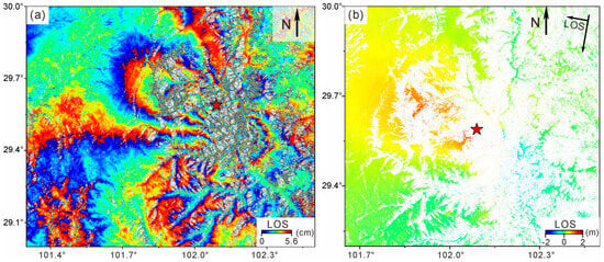 Sentinel-1 interferograms and line-of-sight (LOS) displacements from descending track. (a,b) The red stars indicate the location of the Luding earthquake.