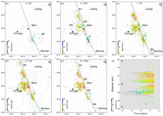Spatial distribution of aftershocks at different times. (a–e) Aftershock activity is shown by colored dots, with the color representing depth. The red star is the location of the mainshock. The black circles indicate divided aftershock groups (S1–S4), and the black lines divide aftershock gaps (G1–G4). (f) Spatial–temporal aftershock evolution. The solid black line shows the direction of expansion of seismic activity over time.