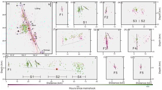 Regional fault profile. (a) The dashed blue line indicates the cross-section profiles, the red star indicates the location of the mainshock, and the black triangle indicates the Gongga Mountain. The red surface indicates the fault plane used to invert the coseismic slip. (b–k) The solid black line indicates the fault fit, and the parameters are given in the text. The dashed black line indicates the trend of changes in the depth of seismic activity. The time in hours until aftershocks occur is indicated by the color.