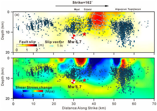 The main rupture of the Luding earthquake is located in the Moxi section of the Xianshuihe Fault, with the coseismic slip concentrated at depths of 0–10 km, extending to the surface (Figure 7a). The depth of the slippage increases gradually from north to south, reaching a maximum of 15 km. Along the fault strike, the coseismic slip exhibits a characteristic pattern, with a lower slip in the north and higher slip in the south, and a maximum slip of ~2 m. Inversion results yield a total Mw of 6.69 for the earthquake, which is consistent with the moment magnitude reported by the GCMT. Earthquake ruptures inevitably induce stress changes in surrounding areas, which are often analyzed to study the spatiotemporal evolution of subsequent seismic events [,,]. In this study, we calculate the shear stress changes on the fault plane caused by the Luding earthquake’s fault slip (Figure 7b). To explain the primary left-lateral strike-slip, we adopt a fixed static friction coefficient of 0.4, which is a typical value of inland strike-slip faults, and assume shear modulus and Poisson’s ratio values of 33 GPa and 0.25, respectively []. The results of the shear stress change show that the stress distribution is basically the opposite of the slip distribution. Areas with large slips are mainly characterized by stress suppression, while the shallow part of the north side of the slip and the south side are characterized by stress loading.