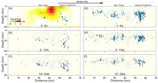 Normally, the areas of coseismic slip and aftershock activity are complementary [,,,]. Coseismic rupture releases stress through slippage, leading to sparse aftershock activity. However, in the regions where slippage transitions to locking, stress is released in the form of aftershocks, which show distinct spatial distribution patterns. In this study, we plot the aftershock activity over different time segments onto the coseismic slip model for further analysis (Figure 8).