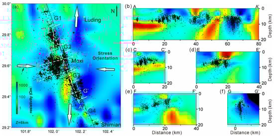 A 3D resistivity structure depth slice. (a) Black dots indicate aftershocks, and red stars indicate the mainshock. The white arrow indicates the stress direction derived from the inversion of the source mechanism. (b–f) Cross-sections of resistivity structure.