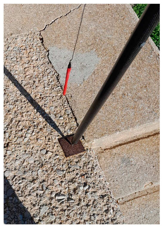 In order to improve the quality of the model and to validate it, a total of 19 ground control points (GCPs) were evenly distributed along the breakwater (as suggested by [,,]). Eleven (11) of the GCPs consisted of 0.5 m × 0.5 m targets with black and white checkerboard square patterns made of polypropylene, which were easily recognizable from above as well as light and easy to handle (Figure 2c). These GCPs were fixed to the ground using steel picks and stones. The remaining GCPs considered were preexisting elements in the study area that were unequivocally identifiable, such as marks in concrete, corners, or metal plates (Figure 3).
