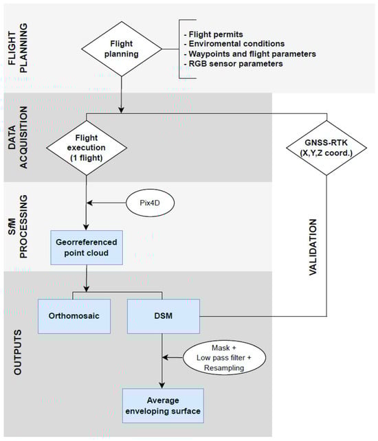 The workflow followed in this study is outlined in Figure 4 and comprises 5 main stages. The first stage consisted of planning the field work—both the UAV flight and the in situ measurements. The second one was data acquisition using the drone and the Real-Time Kinematic Differential Global Positioning Systems (RTK-dGPS). In the third stage, the data were processed through SfM algorithms to obtain photogrammetric products of the breakwater, specifically an orthomosaic and a digital surface model (DSM). The fourth stage consisted of model validation using the GCP position data taken in the field. Finally, in a fifth stage, the DSM of the breakwater was digitally treated in order to define an average enveloping surface from which to quantify several parameters related to the distribution of the deformation that affects the structure. Subsequently, these parameters were compared with the characteristics of the predominant waves in order to define the deformation mechanisms.