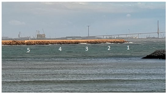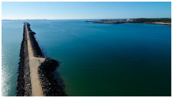 The methodology was applied to one of the breakwaters of the harbor of El Puerto de Santa María, a coastal city in the Atlantic fringe of the province of Cádiz, southern Spain (Figure 1). The municipality, an important tourist destination in summer, consists of two main urban nuclei (namely, El Puerto de Santa María and Valdelagrana) that cluster around the mouth of the river Guadalete, the backbone of the city. El Puerto Santa María is characterized by a diverse landscape where the urban environment blends with natural areas that include 3 km of sandy beaches, the salt marshes of the Río San Pedro tidal channel, large dune fields fixed by reforestation pine forests, and low-lying coastal plains with traditional salt pans that are still under exploitation.