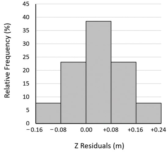 Figure 8 shows the frequency distribution of the residuals in Z. These residuals are the difference between the Z measurements obtained with the differential GNSS and the values of the cells in the same planimetric position on the DSM. The graph shows a symmetric unimodal distribution. The maximum frequency of residuals is registered in the interval 0 to 0.08 m (38% of the cases), while 85% of the points have residuals in the interval −0.08 to +0.16. This demonstrates that the photogrammetric product tends to slightly underestimate Z values.