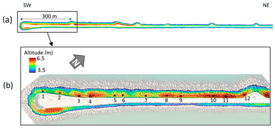 (a) DSM of the entire breakwater; (b) detail of the smoothed DSM (elevation range between 3.5 and 6.5 m) at the SW end of the breakwater with indication of the 12 crests identified.