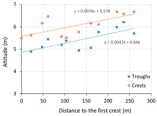 Figure 10 shows the evident downward trend in the height of both the crests and the troughs, with a lowering rate of 40 cm every 100 m towards the end of the breakwater.