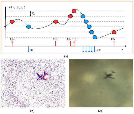 Event-based vision sensors offer extremely high temporal resolution and dynamic range, attributable to their distinctive operational principle. This characteristic makes them adaptable to scenes with more extensive illumination ranges and immune to motion blur, rendering them well-suited for capturing fast-moving objects. Figure 1b,c present visualizations comparing the output of a conventional image sensor with the data captured by the sensors in the same scene. Traditional image sensors capture fast-moving targets, resulting in motion blur due to the constraints of fixed exposure times. In contrast, event-based vision sensors can capture the clear outlines of the aircraft. However, due to the unique data recorded by event-based vision sensors, traditional image-based deep learning algorithms cannot be directly applied. Therefore, it is necessary to develop new event-based algorithms to effectively process and handle event data.