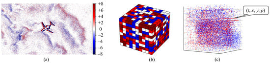 Event representation methods: (a) event frame, (b) event voxel grid, and (c) event quadruple.